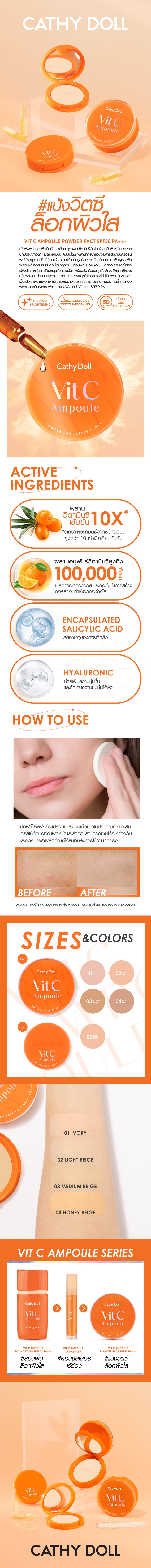 แป้งพัฟผสมรองพื้นเนื้อเนียนละเอียด สูตรผสมวิตามินซีเข้มข้น ช่วยปรับผิวหน้ากระจ่างใส ปกปิดจุดด่างดำ เบลอรูขุมขน คุมมันได้ดี ผสานการบำรุงด้วยสารสกัดซีบัคธอร์น ผลไม้ตระกูลเบอร์รี่ ที่มีส่วนช่วยในการต้านอนุมูลอิสระ ลดเลือนริ้วรอย และฟื้นฟูเซลล์ผิว พร้อมเพิ่มความชุ่มชื้นด้วยไฮยาลูรอน มีส่วนผสมของ Mica ช่วยกระจายแสงให้ผิวเปล่งประกาย ในขณะที่ช่วยดูดซับความมันไปพร้อมกัน ด้วยอณูแป้งเล็กละเอียด เกลี่ยง่าย ปรับผิวเรียบเนียน ปิดร่องแก้ม รอบปาก ข้างจมูกได้เป็นอย่างดี ไม่เป็นคราบ ไม่ตกร่อง เนื้อแป้งเบาสบายผิว เผยผิวสวยอย่างเป็นธรรมชาติ ติดทน คุมมัน กันน้ำกันเหงื่อ พร้อมป้องกันรังสีอินฟาเรด ทั้ง UVA และ UVB ด้วย SPF50 PA+++