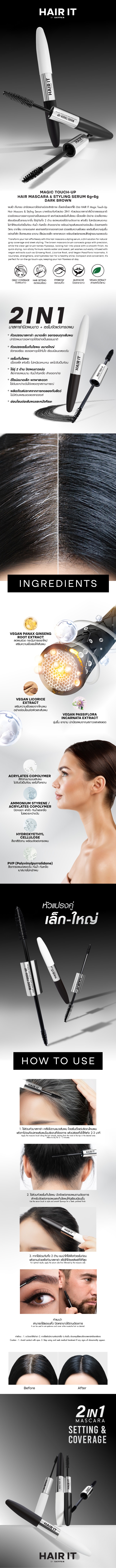 ผมเป๊ะ เก็บทรง ปกปิดผมขาวได้อย่างมีประสิทธิภาพ ตั้งแต่ครั้งแรกที่ใช้ ด้วย HAIR IT Magic Touch-Up Hair Mascara & Styling Serum มาพร้อมกับหัวแปรง 2IN1 หัวแปรงมาสคาร่าสีน้ำตาลธรรมชาติ ช่วยปิดผมขาวเฉพาะจุดอย่างเป็นธรรมชาติ และหัวแปรงเซรั่มเก็บไรผม เนื้อเจลใส ปัดง่าย ช่วยล็อกผมเรียบเนียนเป็นทรงมากขึ้น ใช้คู่กันทั้ง 2 ด้าน เซตผมสวยได้ตามต้องการ แห้งเร็ว ไม่เหนียวเหนอะหนะ ไม่ทำให้ผมจับตัวเป็นก้อน กันน้ำ กันเหงื่อ ล้างออกง่าย พร้อมบำรุงเส้นผมอย่างอ่อนโยน ด้วยสารสกัดวีแกน รากโสม รากชะเอมเทศ และสารสกัดจากดอกเสาวรส ช่วยเสริมความแข็งแรง และเติมเต็มความชุ่มชื้นอย่างล้ำลึก ล็อกผมสวย เงางาม ดีไซน์ขนาดเล็ก พกพาสะดวก พร้อมจัดแต่งทรงผมให้อยู่ทรงนานตลอดวัน