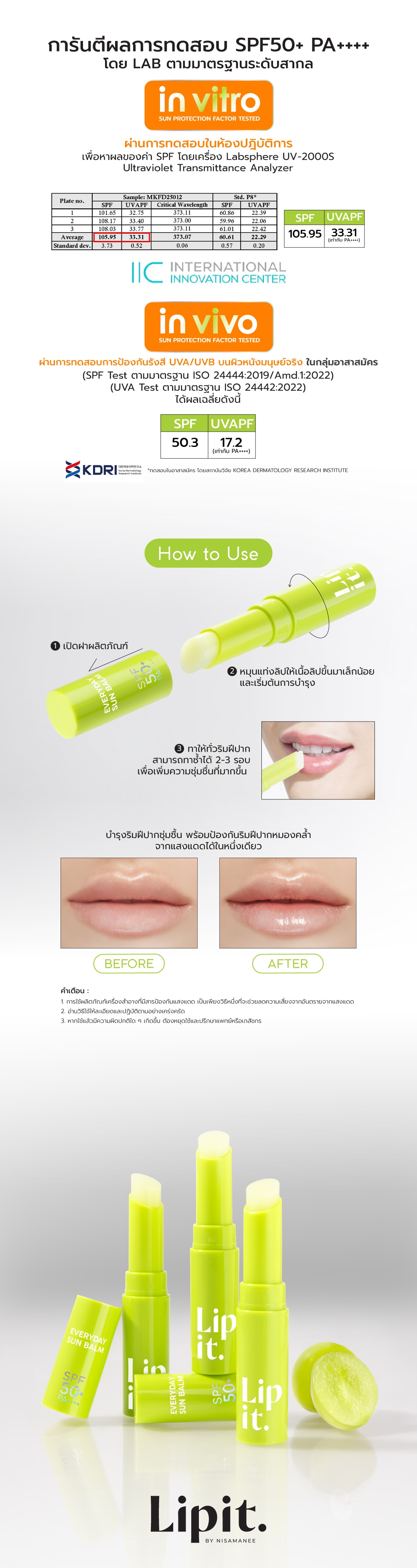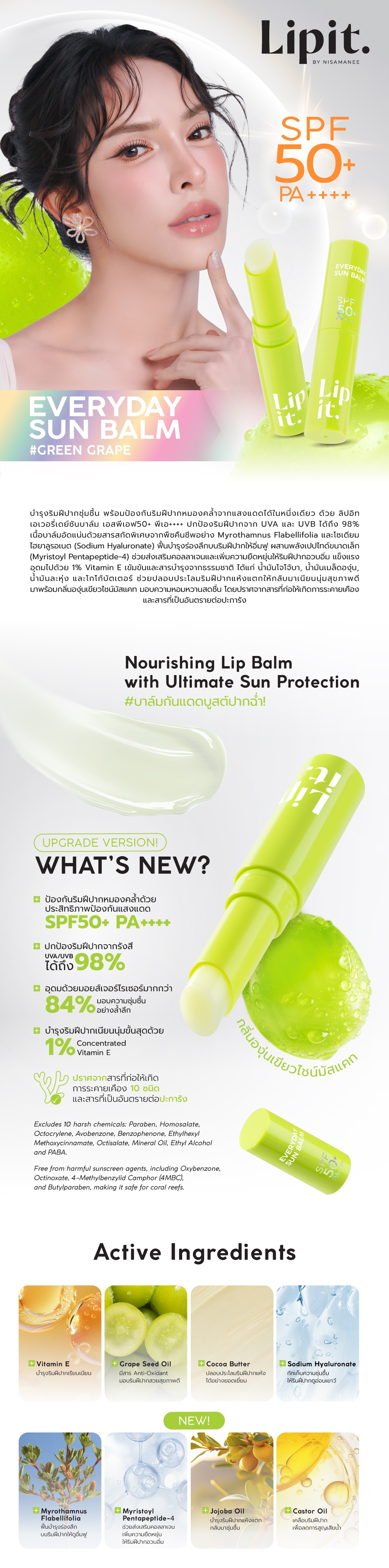 บำรุงริมฝีปากชุ่มชื้น พร้อมป้องกันริมฝีปากหมองคล้ำจากแสงแดดได้ในหนึ่งเดียว ด้วย ลิปอิท เอเวอรี่เดย์ซันบาล์ม เอสพีเอฟ50+ พีเอ++++ ปกป้องริมฝีปากจาก UVA และ UVB ได้ถึง 98% เนื้อบาล์มอัดแน่นด้วยสารสกัดพิเศษจากพืชคืนชีพอย่าง Myrothamnus Flabellifolia และโซเดียม ไฮยาลูรอเนต (Sodium Hyaluronate) ฟื้นบำรุงร่องลึกบนริมฝีปากให้อิ่มฟู ผสานพลังเปปไทด์ขนาดเล็ก (Myristoyl Pentapeptide-4) ช่วยส่งเสริมคอลลาเจนและเพิ่มความยืดหยุ่นให้ริมฝีปากอวบอิ่ม แข็งแรง อุดมไปด้วย 1% Vitamin E เข้มข้นและสารบำรุงจากธรรมชาติ ได้แก่ น้ำมันโจโจ้บา น้ำมันเมล็ดองุ่น น้ำมันละหุ่ง และโกโก้บัตเตอร์ ช่วยปลอบประโลมริมฝีปากแห้งแตกให้กลับมาเนียนนุ่มสุขภาพดี มาพร้อมกลิ่นองุ่นเขียวไชน์มัสแคท มอบความหอมหวานสดชื่น โดยปราศจากสารที่ก่อให้เกิดการระคายเคืองและสารที่เป็นอันตรายต่อปะการัง