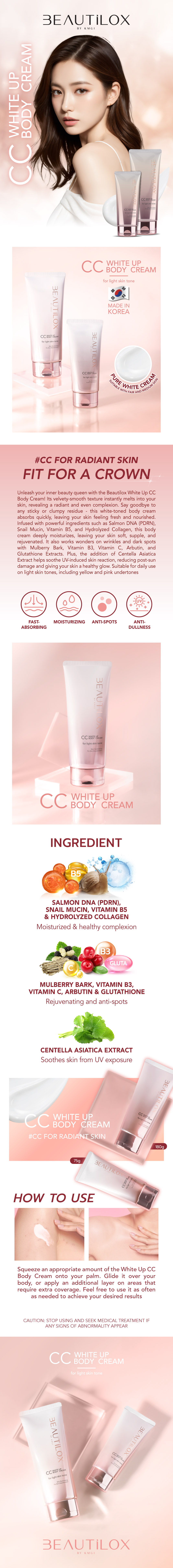 Unleash your inner beauty queen with the Beautilox White Up CC Body Cream! Its velvety-smooth texture instantly melts into your skin, revealing a radiant and even complexion. Say goodbye to any sticky or clumpy residue - this white-toned body cream absorbs quickly, leaving your skin feeling fresh and nourished. Infused with powerful ingredients such as Salmon DNA (PDRN), Snail Mucin, Vitamin B5, and Hydrolyzed Collagen, this body cream deeply moisturizes, leaving your skin soft, supple, and rejuvenated. It also works wonders on wrinkles and dark spots with Mulberry Bark, Vitamin B3, Vitamin C, Arbutin, and Glutathione Extracts. Plus, the addition of Centella Asiatica Extract helps soothe UV-induced skin reaction, reducing post-sun damage and giving your skin a healthy glow. Suitable for daily use on light skin tones, including yellow and pink undertones.