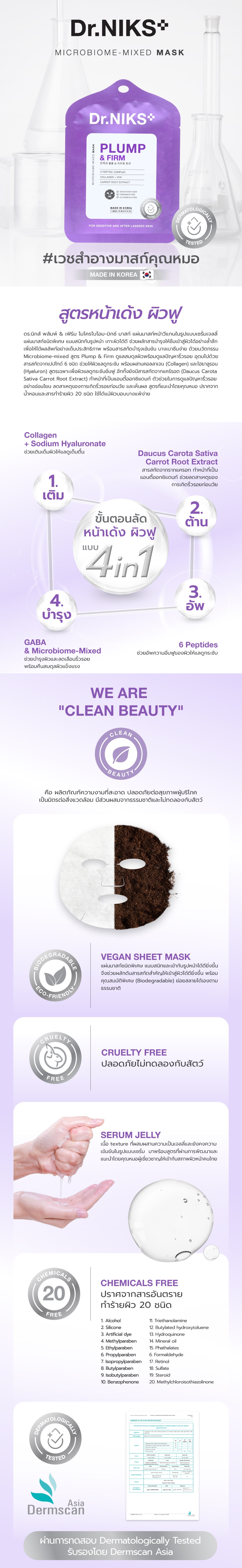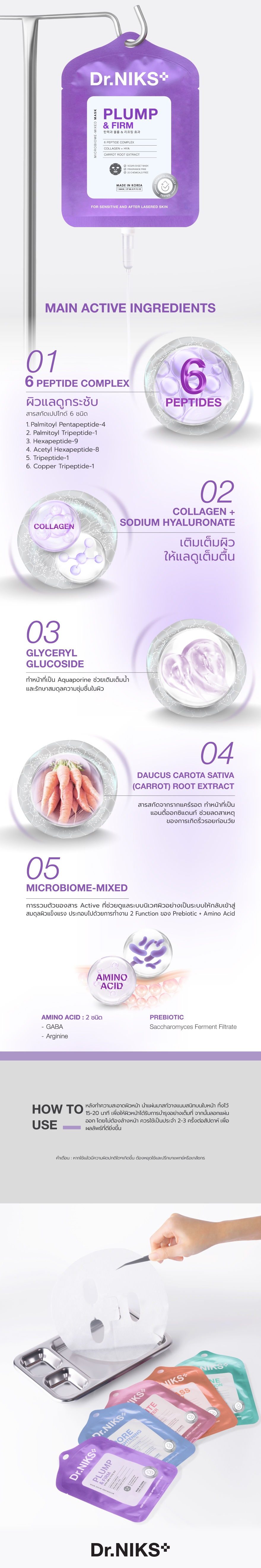 ดร.นิกส์ พลัมพ์ & เฟิร์ม ไมโครไบโอม-มิกซ์ มาสก์ แผ่นมาสก์หน้าวีแกนในรูปแบบเซรั่มเจลลี่ แผ่นมาสก์ชนิดพิเศษ แนบสนิทกับรูปหน้า เกาะผิวได้ดี ช่วยผลักสารบำรุงให้ซึมเข้าสู่ผิวได้อย่างล้ำลึกเพื่อให้ได้ผลลัพท์อย่างเต็มประสิทธิภาพ พร้อมสารสกัดบำรุงเข้มข้น บางเบาซึมง่าย ด้วยนวัตกรรม Microbiome-mixed สูตร Plump & Firm ดูแลสมดุลผิวพร้อมดูแลปัญหาริ้วรอย อุดมไปด้วยสารสกัดจากเปปไทด์ 6 ชนิด ช่วยให้ผิวแลดูกระชับ พร้อมผสานคอลลาเจน (Collagen) และไฮยาลูรอน (Hyaluron) สูตรเฉพาะเพื่อผิวแลดูกระชับอิ่มฟู อีกทั้งยังมีสารสกัดจากแคร์รอต (Daucus Carota Sativa Carrot Root Extract) ทำหน้าที่เป็นแอนตี้ออกซิแดนท์ ตัวช่วยในการดูแลปัญหาริ้วรอยอย่างอ่อนโยน ลดสาเหตุของการเกิดริ้วรอยก่อนวัย และเห็นผล สูตรที่แนะนำโดยคุณหมอ ปราศจากน้ำหอมและสารทำร้ายผิว 20 ชนิด ใช้ได้แม้ผิวบอบบางแพ้ง่าย