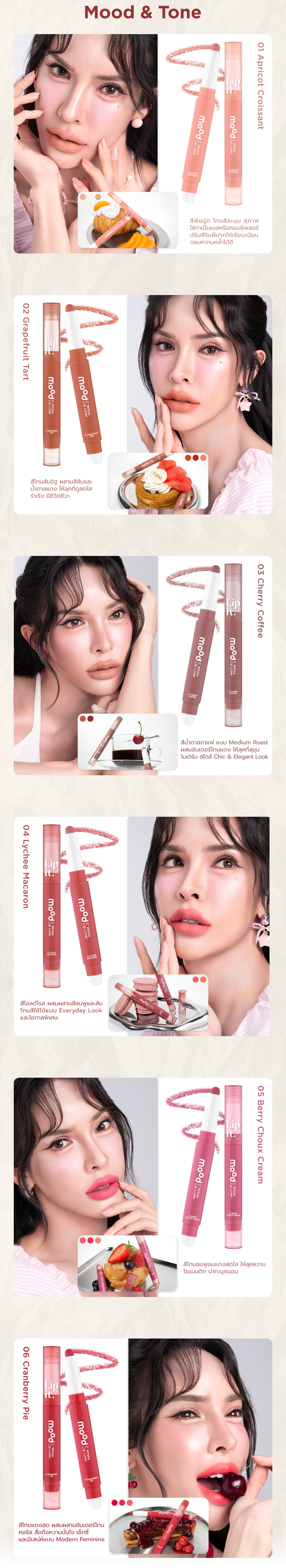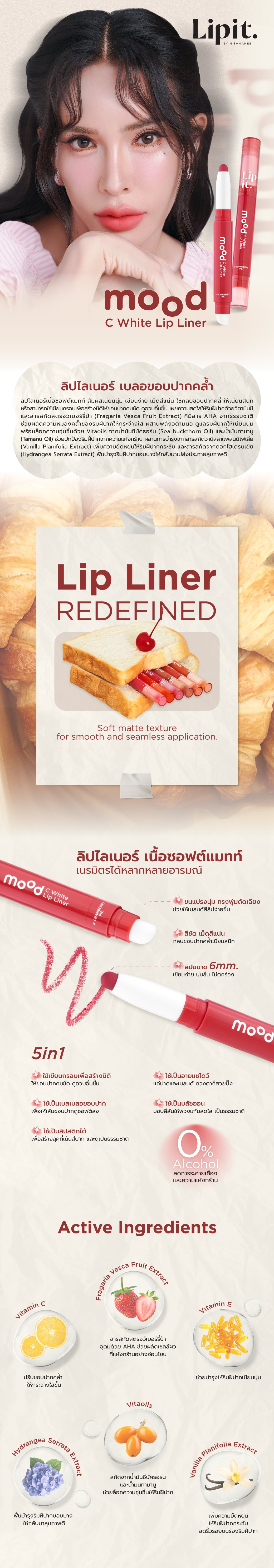 ลิปไลเนอร์เนื้อซอฟต์แมทท์ สัมผัสเนียนนุ่ม เขียนง่าย เม็ดสีแน่น ใช้กลบขอบปากคล้ำให้เนียนสนิท หรือสามารถใช้เขียนกรอบเพื่อสร้างมิติให้ขอบปากคมชัด ดูอวบอิ่มขึ้น เผยความสดใสให้ริมฝีปากด้วยวิตามินซี และสารสกัดสตรอว์เบอร์รี่ป่า (Fragaria Vesca Fruit Extract) ที่มีสาร AHA จากธรรมชาติ ช่วยผลัดความหมองคล้ำของริมฝีปากให้กระจ่างใส ผสานพลังวิตามินอี ดูแลริมฝีปากให้เนียนนุ่ม พร้อมล็อกความชุ่มชื้นด้วย Vitaoils จากน้ำมันซีบัคธอร์น (Sea buckthorn Oil) และน้ำมันทามานู (Tamanu Oil) ช่วยปกป้องริมฝีปากจากความแห้งกร้าน ผสานการบำรุงจากสารสกัดวานิลลาแพลนนิโฟเลีย (Vanilla Planifolia Extract) เพิ่มความยืดหยุ่นให้ริมฝีปากกระชับ และสารสกัดจากดอกไฮเดรนเยีย (Hydrangea Serrata Extract) ฟื้นบำรุงริมฝีปากบอบบางให้กลับมาเปล่งประกายสุขภาพดี