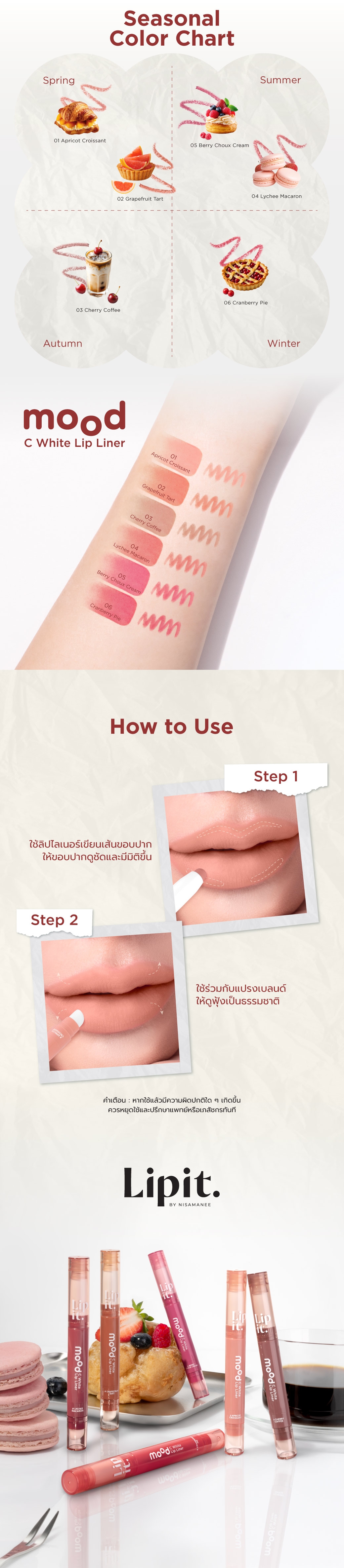 ดึงเพื่อเปิดฝาผลิตภัณฑ์ หมุนเนื้อลิปขึ้นมาเล็กน้อย ใช้ลิปไลเนอร์เขียนเพื่อสร้างเส้นขอบปาก ให้ขอบปากดูชัดและมีมิติขึ้น สามารถใช้ร่วมกับแปรงเบลนด์ให้ดูฟุ้งเป็นธรรมชาติ ปิดฝาให้สนิททุกครั้งหลังใช้