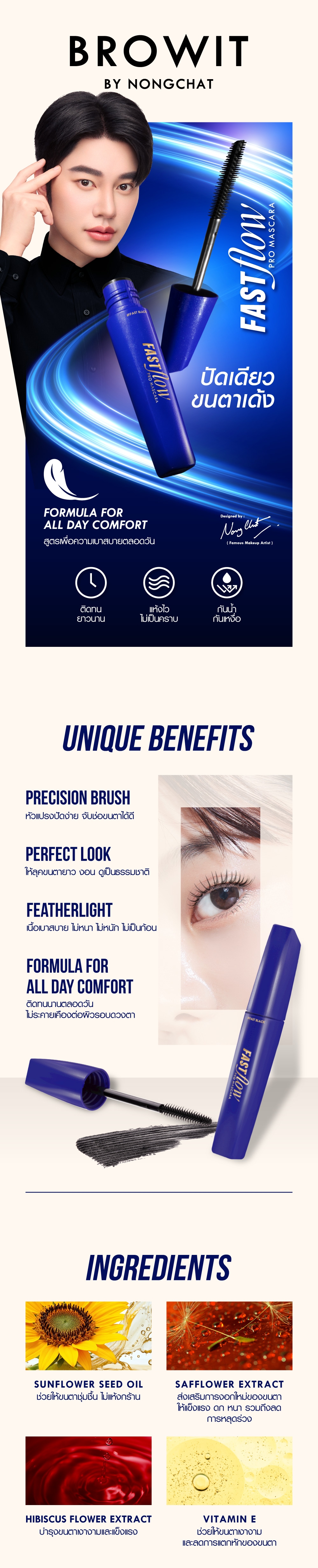 มาสคาร่าที่ตอบโจทย์ทุกลุคในทุกวัน เนื้อมาสคาร่าเบาสบาย ไม่หนักตา ไม่จับตัวเป็นก้อน ช่วยเพิ่มความยาว ความโค้งงอนและวอลลุ่มให้ขนตาแบบเส้นต่อเส้นด้วยหัวแปรงที่ออกแบบมาเพื่อช่วยกระจายเส้นขนตาได้อย่างมีประสิทธิภาพ ปัดง่าย รวดเร็ว ให้ขนตายาว โค้งงอน มีวอลลุ่ม เสริมลุคให้สมบูณ์แบบ ติดทนยาวนาน กันน้ำกันเหงื่อ ไม่ระคายเคืองต่อผิวรอบดวงตา อีกทั้งยังมีน้ำมันจากเมล็ดทานตะวัน สารสกัดจากดอกคำฝอยและดอกกระเจี๊ยบ ช่วยบำรุงขนตา ไม่ทำให้ขนตาหลุดร่วง