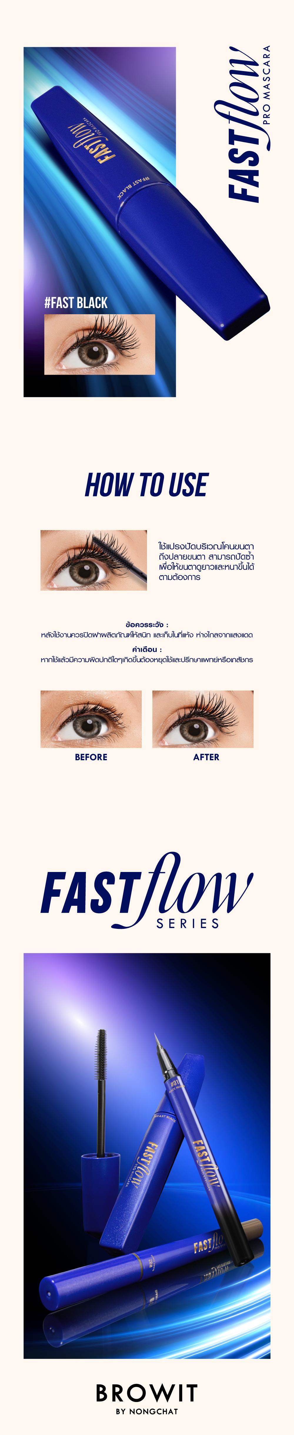 หมุนเปิดฝาผลิตภัณฑ์แล้วใช้แปรงปัดบริเวณโคนขนตาถึงปลายขนตา สามารถปัดซ้ำเพื่อให้ขนตาดูยาวและหนาขึ้นได้ตามต้องการ หลังจากใช้งาน ควรปิดฝาผลิตภัณฑ์ให้สนิท และเก็บในที่แห้ง ห่างไกลจากแสงแดด