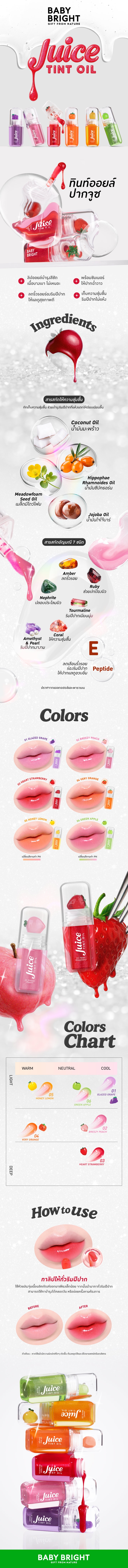 เบบี้ไบร์ท จูซทินท์ออยล์ ลิปออยล์บำรุงริมฝีปาก สีชัด เนื้อบางเบา ไม่เหนียวเหนอะหนะ มาพร้อมชิมเมอร์ให้ริมฝีปากดูฉ่ำวาว อุดมไปด้วยสารสกัดจากน้ำมันซีบัคธอร์น (Hippophae Rhamnoides Fruit Oil) ช่วยเพิ่มและคงความชุ่มชื้นให้ริมฝีปาก สารสกัดจากน้ำมันมะพร้าว (Coconut Oil) ที่ช่วยบำรุงริมฝีปากที่แห้งแตกให้เรียบเนียนขึ้น น้ำมันโจโจ้บา (Simmondsia Chinensis (Jojoba) Seed Oil) ช่วยลดการสูญเสียน้ำ ช่วยให้ริมฝีปากแลดูอ่อนเยาว์ น้ำมันเมล็ดมีโดว์โฟม (Limnanthes Alba Seed Oil) และวิตามินอี (Tocopheryl Acetate) ที่มีสารแอนตี้ออกซิแดนท์ ช่วยบำรุงริมฝีปาก พร้อมเติมเต็มความชุ่มชื้น ดูเรียบเนียน และช่วยลดเลือนริ้วรอยร่องปาก ผสานเข้ากับอัญมณีจากธรรมชาติ 7 ชนิด ได้แก่ Amber Powder, Amethyst Powder, Pearl Powder, Coral Powder, Nephrite Powder, Ruby Powder, Tourmaline ที่ช่วยบำรุงและลดเลือนริ้วรอยร่องปาก ให้ความชุ่มชื้นแก่ริมฝีปาก และเปปไทด์ (Palmitoyl Tripeptide-38) ช่วยลดริ้วรอยร่องปาก ให้ริมฝีปากแลดูสุขภาพดี ปราศจากแอลกอฮอล์และพาราเบน