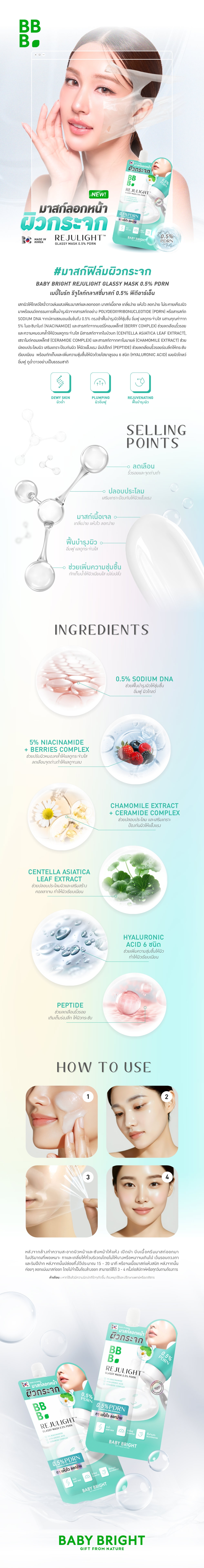เสกผิวให้โกลว์ใสฉ่ำวาวเล่นแสง เพียงลอกออก! ด้วยเบบี้ไบร์ท รีจูไลท์กลาสซี่มาสก์ 0.5% พีดีอาร์เอ็น มาสก์เนื้อเจล เกลี่ยง่าย แห้งไว ลอกง่าย ไม่ระคายเคืองผิว มาพร้อมนวัตกรรมการฟื้นบำรุงผิวจากสารสกัด Polydeoxyribonucleotide (PDRN) หรือสารสกัด Sodium DNA จากปลาแซลมอนเข้มข้นถึง 0.5% ตรงเข้าฟื้นบำรุงผิวให้ชุ่มชื้น อิ่มฟู แลดูกระจ่างใส ผสานคุณค่าจาก 5% ไนอะซินาไมด์ (Niacinamide) และสารสกัดจากเบอร์รี่คอมเพล็กซ์ (Berry Complex) ช่วยลดเลือนริ้วรอยและความหมองคล้ำให้ผิวแลดูกระจ่างใส มีสารสกัดจากใบบัวบก (Centella Asiatica Leaf Extract) เซราไมด์คอมเพล็กซ์ (Ceramide Complex) และสารสกัดจากคาโมมายล์ (Chamomile Extract) ช่วยปลอบประโลมผิว เสริมเกราะป้องกันผิว ให้ผิวแข็งแรง มีเปปไทด์ (Peptide) ช่วยลดเลือนริ้วรอยร่องลึกให้กระชับเรียบเนียน พร้อมกักเก็บและเพิ่มความชุ่มชื้นให้ผิวด้วยไฮยาลูรอน 6 ชนิด (Hyaluronic Acid) เผยผิวโกลว์ อิ่มฟู ดูฉ่ำวาวอย่างเป็นธรรมชาติ