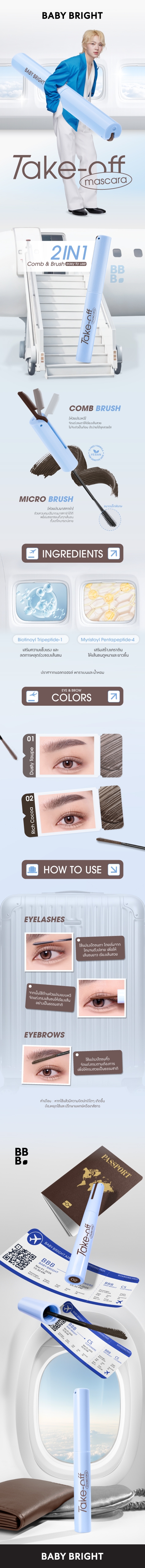 ปัดได้ครบ จบในแท่งเดียว กับ เบบี้ไบร์ท เทคออฟมาสคาร่า 2-in-1 ช่วยให้ขนตาและขนคิ้วเรียงเส้นสวยเป็นธรรมชาติ โดดเด่น มั่นใจได้ตลอดวัน กันน้ำ กันเหงื่อ ติดทน เสริมคุณค่าวีแกน 100% พร้อมบำรุงในทุกครั้งที่ปัด เพราะอุดมด้วย Biotinoyl Tripeptide-1 ที่ช่วยบำรุงและเสริมความแข็งแรง ลดการหลุดร่วงของเส้นขน และ Myristoyl Pentapeptide-4 ที่ช่วยเสริมสร้างเคราติน โปรตีนสำคัญในโครงสร้างเส้นขน ให้เส้นขนดูหนาและยาวขึ้น หัวแปรงมาสคาร่าขนาดเล็กพิเศษ (Micro Brush) ช่วยควบคุมปริมาณมาสคาร่าได้ดี พร้อมซอกซอนถึงทุกเส้นขนตั้งแต่โคนจรดปลาย มาพร้อมหัวแปรงหวีสุดพิเศษ ช่วยจัดแต่งขนตาให้เรียงเส้นสวย ไม่จับเป็นก้อน ปัดง่ายได้ลุคที่สดใส อีกทั้งยังสามารถใช้ปัดขนคิ้วเพื่อจัดทรงสวยเป็นธรรมชาติ ปราศจากแอลกอฮอล์ พาราเบน และน้ำหอม