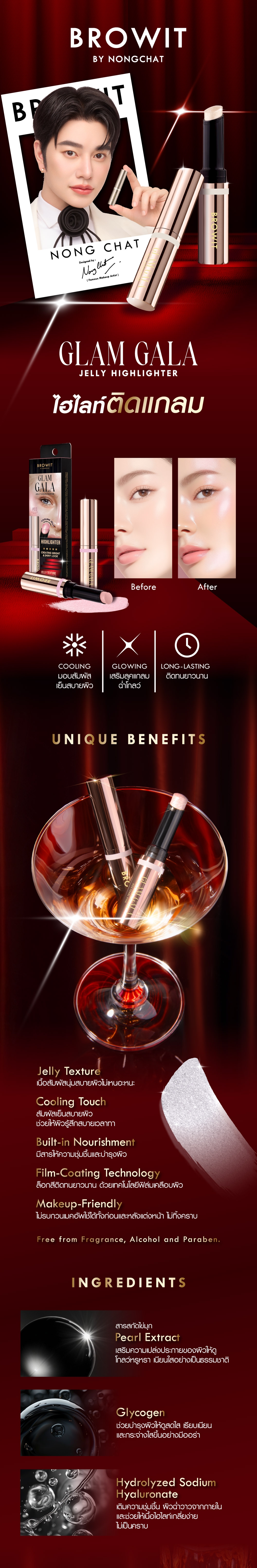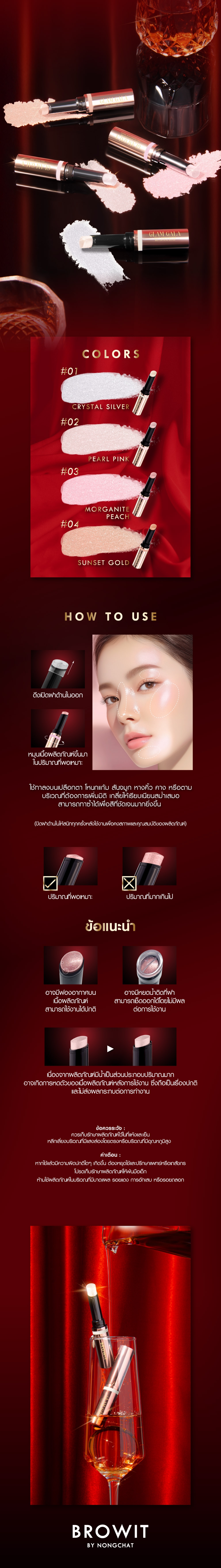 เนรมิตผิวหน้าให้โดดเด่นด้วยไฮไลท์เจลลี่แบบแท่ง เนื้อสัมผัสนุ่มเด้ง บางเบา เกลี่ยง่ายสบายผิว เพิ่มความฉ่ำโกลว์เป็นประกายระยิบระยับ เสริมลุคให้โดดเด่นมีมิติ ติดทนยาวนานด้วยเทคโนโลยีฟิล์มเคลือบสุดล้ำช่วยล็อกชั้นประกายมุกและชิมเมอร์ มอบความเปล่งประกายยาวนาน ไม่ซีดจาง ผสานสารสกัดจากไข่มุกดำ ไฮยา และไกลโคเจน ช่วยให้ผิวชุ่มชื้นอิ่มฟู กระจ่างใสเรียบเนียน สามารถทาได้ทั้งก่อนและหลังแต่งหน้า ไม่ทิ้งคราบหรือรบกวนเมคอัพ