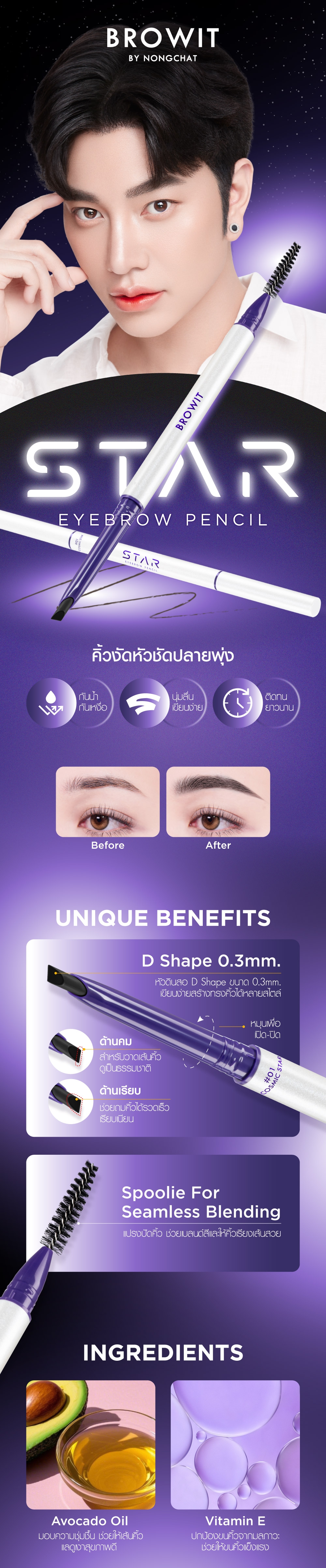 ดินสอเขียนคิ้วหัว D Shape เส้นเรียวเล็กเพียง 0.3 mm เขียนลื่นไม่มีสะดุด ช่วยสร้างคิ้วให้ดูมีมิติ โทนสีธรรมชาติ ใช้ได้กับทุกลุค ผสานการบำรุงจากน้ำมันอะโวคาโด มอบความชุ่มชื้นให้ผิว เส้นคิ้วเงาแลดูสุขภาพดี และวิตามินอีเป็นสารช่วยแอนตี้ออกซิแดนท์ เนื้อดินสอไม่เปราะหรือหักง่าย กันน้ำ ติดทน มาพร้อมแปรงปัดคิ้ว ช่วยเบลนด์สีและให้คิ้วเรียงเส้นสวยโดดเด่นมากยิ่งขึ้น