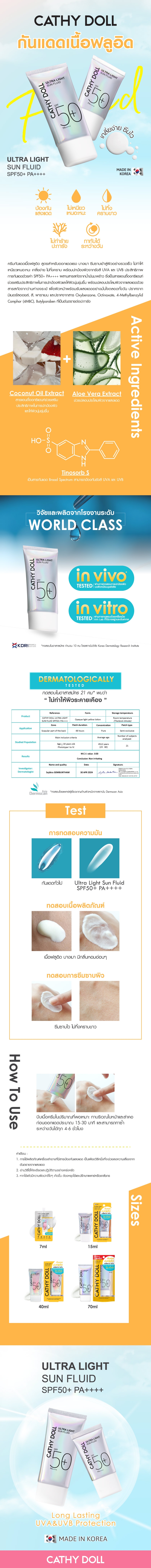 ครีมกันแดดเนื้อฟลูอิด สูตรสำหรับออกแดดแรง บางเบา ซึมซาบเข้าสู่ผิวอย่างรวดเร็ว ไม่ทำให้เหนียวเหนอะหนะ เกลี่ยง่าย ไม่ทิ้งคราบ พร้อมปกป้องผิวจากรังสี UVA และ UVB เพิ่มประสิทธิภาพการกันแดดจาก SPF50 เป็น SPF50+ PA++++ ผสานสารสกัดจากน้ำมันมะพร้าว ซึ่งเป็นสารแอนตี้ออกซิแดนท์ช่วยเสริมประสิทธิภาพในการปกป้องผิวและให้ผิวนุ่มชุ่มชื่น พร้อมปลอบประโลมผิวจากแสงแดดด้วยสารสกัดจากว่านหางจระเข้ เพื่อผิวหน้าพร้อมรับแสงแดดอย่างมั่นใจตลอดทั้งวัน ปราศจากมิเนอรัลออยล์, สี, พาราเบน และปราศจากสาร Oxybenzone, Octinoxate, 4-Methylbenzylid Camphor (4MBC), Butylparaben ที่เป็นอันตรายต่อปะการัง