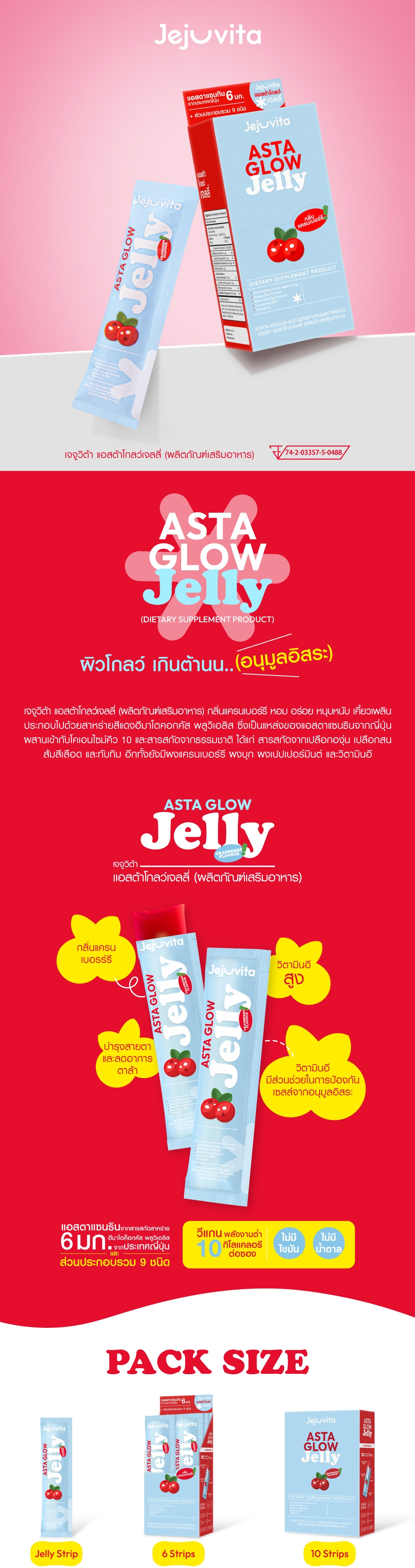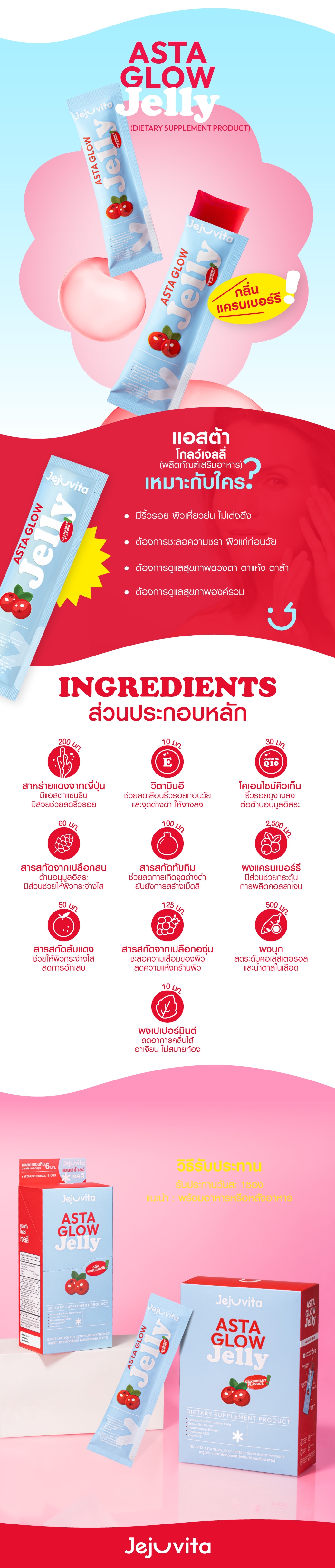 เจจูวิต้า แอสต้าโกลว์เจลลี่ (ผลิตภัณฑ์เสริมอาหาร) กลิ่นแครนเบอร์รี หอม อร่อย หนุบหนับ เคี้ยวเพลิน ประกอบไปด้วยสาหร่ายสีแดงฮีมาโตคอกคัส พลูวิเอลิส ซึ่งเป็นแหล่งของแอสตาแซนธินจากญี่ปุ่น ผสานเข้ากับโคเอนไซม์คิว 10 และสารสกัดจากธรรมชาติ ได้แก่ สารสกัดจากเปลือกองุ่น เปลือกสน ส้มสีเลือด และทับทิม อีกทั้งยังมี ผงแครนเบอร์รี ผงบุก ผงเปปเปอร์มินต์ และวิตามินอี