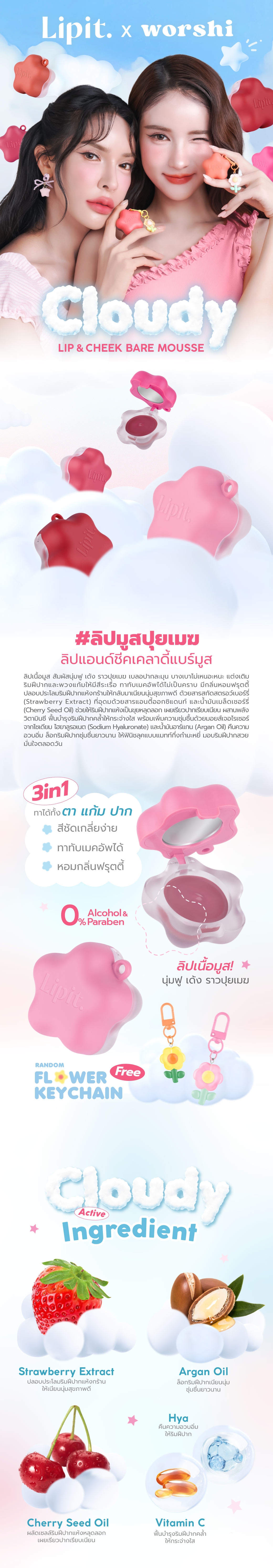 ลิปเนื้อมูส สัมผัสนุ่มฟู เด้ง ราวปุยเมฆ เบลอปากละมุน บางเบาไม่เหนอะหนะ แต่งเติมริมฝีปากและพวงแก้มให้มีสีระเรื่อ ทาทับเมคอัพได้ไม่เป็นคราบ มีกลิ่นหอมฟรุตตี้ ปลอบประโลมริมฝีปากแห้งกร้านให้กลับมาเนียนนุ่มสุขภาพดี ด้วยสารสกัดสตรอว์เบอร์รี่ (Strawberry Extract) ที่อุดมด้วยสารแอนตี้ออกซิแดนท์ และน้ำมันเมล็ดเชอร์รี่ (Cherry Seed Oil) ช่วยให้ริมฝีปากแห้งเป็นขุยหลุดลอก เผยเรียวปากเรียบเนียน ผสานพลังวิตามินซี ฟื้นบำรุงริมฝีปากคล้ำให้กระจ่างใส พร้อมเพิ่มความชุ่มชื้นด้วยมอยส์เจอไรเซอร์จากโซเดียม ไฮยาลูรอเนต (Sodium Hyaluronate) และน้ำมันอาร์แกน (Argan Oil) คืนความอวบอิ่ม ล็อกริมฝีปากชุ่มชื่นยาวนาน ให้ฟินิชลุคแบบแมทท์กึ่งกำมะหยี่ มอบริมฝีปากสวย มั่นใจตลอดวัน