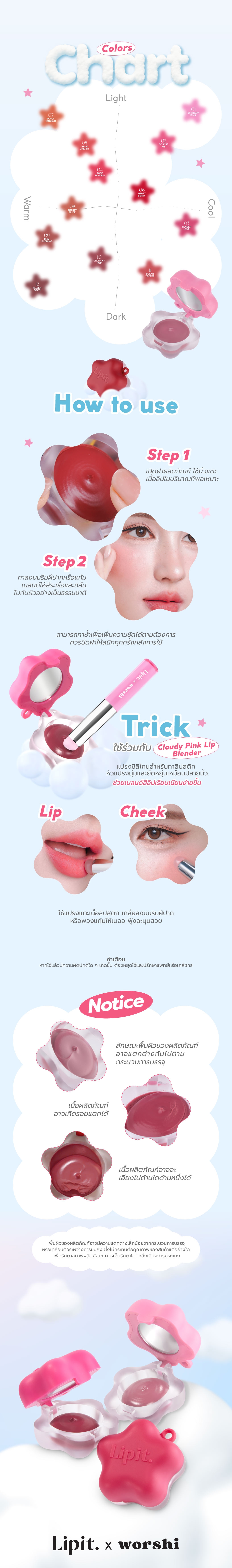 เปิดฝาผลิตภัณฑ์ ใช้นิ้วแตะเนื้อลิปในปริมาณที่พอเหมาะ จากนั้นทาลงบนริมฝีปากหรือแก้ม เบลนด์ให้สีระเรื่อและกลืนไปกับผิวอย่างเป็นธรรมชาติ สามารถทาซ้ำเพื่อเพิ่มความชัดได้ตามต้องการ ควรปิดฝาให้สนิททุกครั้งหลังการใช้