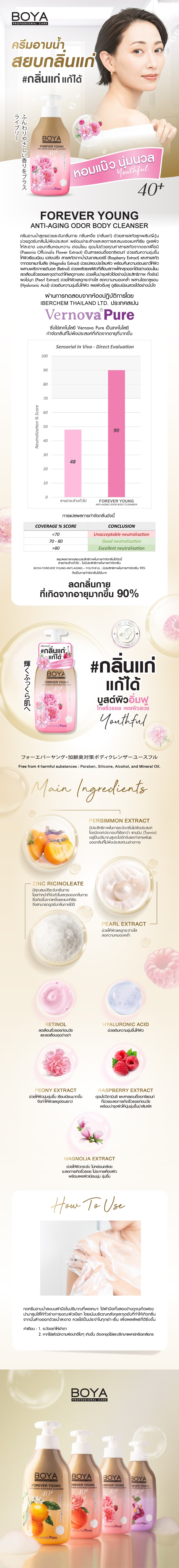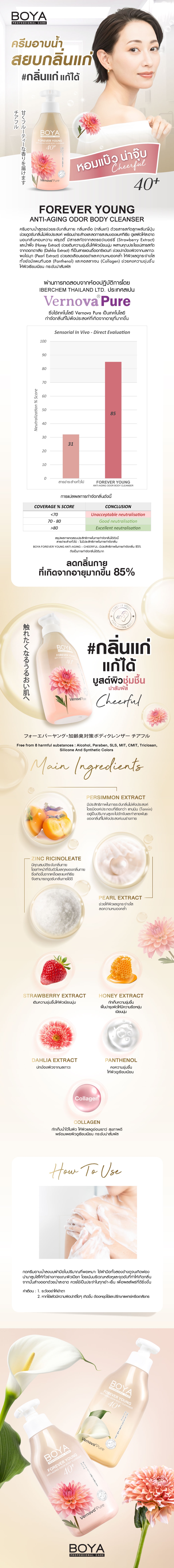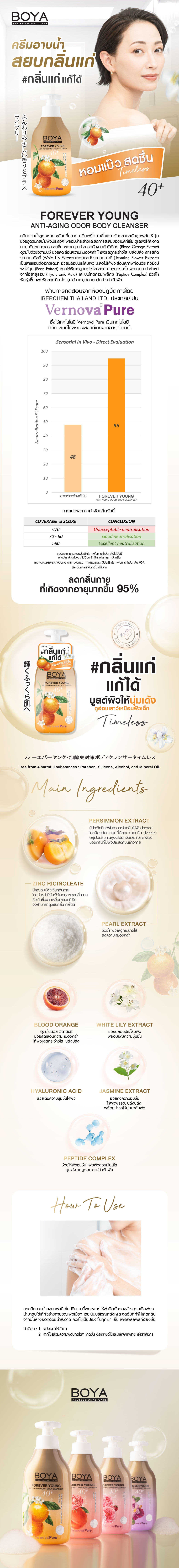 โบย่า ฟอร์เอฟเวอร์ ยัง แอนตี้-เอจจิ้ง ออดอร์ บอดี้ คลีนเซอร์ ไทม์เลส ครีมอาบน้ำสูตรช่วยระงับกลิ่นกาย กลิ่นเหงื่อ (กลิ่นแก่) ด้วยสารสกัดลูกพลับญี่ปุ่น ช่วยดูดซับกลิ่นไม่พึงประสงค์ พร้อมชำระล้างและลดการสะสมของแบคทีเรีย ดูแลผิวให้สะอาด มอบกลิ่นหอมสะอาด สดชื่น ผสานคุณค่าสารสกัดจากส้มสีเลือด (Blood Orange Extract) อุดมไปด้วยวิตามินซี ช่วยลดเลือนความหมองคล้ำ ให้ผิวแลดูกระจ่างใส เปล่งปลั่ง สารสกัดจากดอกลิลลี่ (White Lily Extract) และสารสกัดจากดอกมะลิ (Jasmine Flower Extract) เป็นสารแอนตี้ออกซิแดนท์ ช่วยปลอบประโลมผิว ชะลอไม่ให้ผิวเสื่อมสภาพก่อนวัย ทั้งยังมีผงไข่มุก (Pearl Extract) ช่วยให้ผิวแลดูกระจ่างใส ลดความหมองคล้ำ ผสานคุณประโยชน์จากไฮยาลูรอน (Hyaluronic Acid) และเปปไทด์คอมเพล็กซ์ (Peptide Complex) ช่วยให้ผิวชุ่มชื้น เผยผิวสวยเนียนใส นุ่มเด้ง แลดูอ่อนเยาว์อย่างน่าสัมผัส ปราศจากสารที่ก่อให้เกิดการระคายเคือง 4 ชนิด Paraben, Silicone, Alcohol และ Mineral Oil