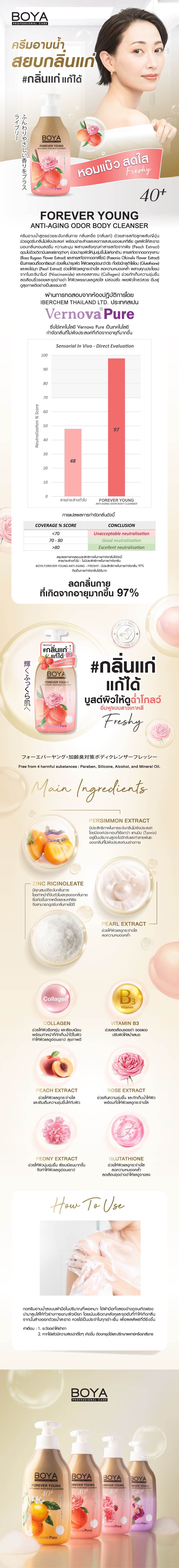 โบย่า ฟอร์เอฟเวอร์ ยัง แอนตี้-เอจจิ้ง ออดอร์ บอดี้ คลีนเซอร์ เฟรชชี่ ครีมอาบน้ำสูตรช่วยระงับกลิ่นกาย กลิ่นเหงื่อ (กลิ่นแก่) ด้วยสารสกัดลูกพลับญี่ปุ่น ช่วยดูดซับกลิ่นไม่พึงประสงค์ พร้อมชำระล้างและลดการสะสมของแบคทีเรีย ดูแลผิวให้สะอาด มอบกลิ่นหอมสดชื่น หวานละมุน ผสานพลังคุณค่าสารสกัดจากพีช (Peach Extract) อุดมไปด้วยวิตามินและแร่ธาตุต่างๆ ช่วยบำรุงผิวให้นุ่มชุ่มชื้น ไม่แห้งกร้าน สารสกัดจากดอกกุหลาบ (Rosa Rugosa Flower Extract) และสารสกัดจากดอกพีโอนี (Paeonia Officinalis Flower Extract) เป็นสารแอนตี้ออกซิแดนท์ ช่วยฟื้นฟูผิว ให้ผิวแลดูอ่อนกว่าวัย ทั้งยังมีกลูต้าไธโอน (Glutathione) และผงไข่มุก (Pearl Extract) ช่วยให้ผิวแลดูกระจ่างใส ลดความหมองคล้ำ ผสานคุณประโยชน์จากไนอะซินาไมด์ (Niacinamide) และคอลลาเจน (Collagen) ช่วยกักเก็บความชุ่มชื้น ลดเลือนริ้วรอยและจุดด่างดำ ให้ผิวพรรณแลดูสดใส เปล่งปลั่ง เผยผิวโกลว์สวย อิ่มฟู ดูสุขภาพดีอย่างเป็นธรรมชาติ ปราศจากสารที่ก่อให้เกิดการระคายเคือง 4 ชนิด Paraben, Silicone, Alcohol และ Mineral Oil