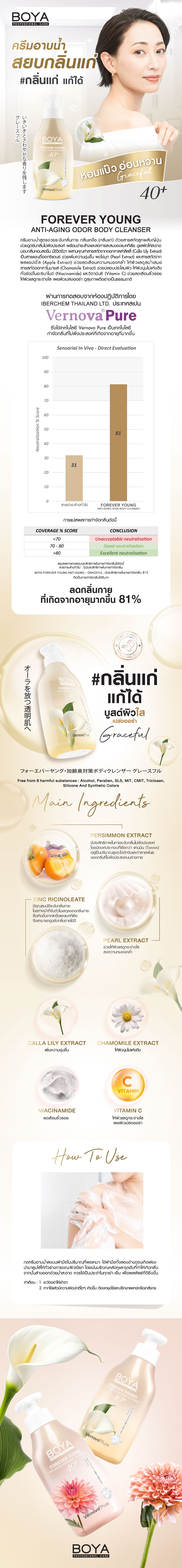 โบย่า ฟอร์เอฟเวอร์ยังแอนตี้-เอจจิ้งออดอร์บอดี้คลีนเซอร์ เกรซฟูล ครีมอาบน้ำสูตรช่วยระงับกลิ่นกาย กลิ่นเหงื่อ (กลิ่นแก่) ด้วยสารสกัดลูกพลับญี่ปุ่น ช่วยดูดซับกลิ่นไม่พึงประสงค์ พร้อมชำระล้างและลดการสะสมของแบคทีเรีย ดูแลผิวให้สะอาด มอบกลิ่นหอมสดชื่น มีชีวิตชีวา ผสานคุณค่าสารสกัดจากดอกคาลล่าลิลลี่ (Calla Lily Extract) เป็นสารแอนตี้ออกซิแดนท์ ช่วยเพิ่มความชุ่มชื้น ผงไข่มุก (Pearl Extract) และสารสกัดจากผลแอปเปิ้ล (Apple Extract) ช่วยลดเลือนความหมองคล้ำ ให้ผิวแลดูสม่ำเสมอ สารสกัดดอกคาโมมายล์ (Chamomile Extract) ช่วยปลอบประโลมผิว ให้ผิวนุ่มไม่แห้งตึง ทั้งยังมีไนอะซินาไมด์ (Niacinamide) และวิตามินซี (Vitamin C) ช่วยลดเลือนริ้วรอย ให้ผิวแลดูกระจ่างใส เผยผิวเปล่งออร่า ดูสุขภาพดีอย่างเป็นธรรมชาติ ปราศจากสารที่ก่อให้เกิดการระคายเคือง ได้แก่ Alcohol, Paraben, SLS, MIT / CMIT, Triclosan, Silicone และ Synthetic Colors