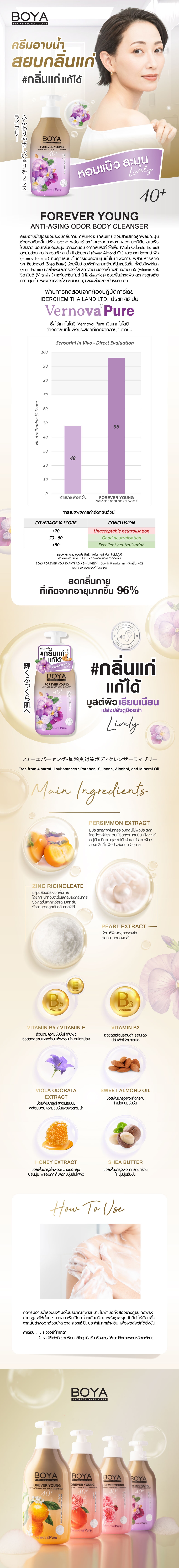โบย่า ฟอร์เอฟเวอร์ ยัง แอนตี้-เอจจิ้ง ออดอร์ บอดี้ คลีนเซอร์ ไลฟ์ลี่ ครีมอาบน้ำสูตรช่วยระงับกลิ่นกาย กลิ่นเหงื่อ (กลิ่นแก่) ด้วยสารสกัดลูกพลับญี่ปุ่น ช่วยดูดซับกลิ่นไม่พึงประสงค์ พร้อมชำระล้างและลดการสะสมของแบคทีเรีย ดูแลผิวให้สะอาด มอบกลิ่นหอมละมุน น่าทะนุถนอม จากกลิ่นสวีทไวโอเล็ต (Viola Odorata Extract) อุดมไปด้วยคุณค่าสารสกัดจากน้ำมันอัลมอนด์ (Sweet Almond Oil) และสารสกัดจากน้ำผึ้ง (Honey Extract) ที่มีคุณสมบัติในการเติมความชุ่มชื้นให้แก่ผิวกาย ผสานสารสกัดจากเชียบัตเตอร์ (Shea Butter) ช่วยฟื้นฟูผิวที่หยาบกร้านให้นุ่มชุ่มชื้นขึ้น ทั้งยังมีผงไข่มุก (Pearl Extract) ช่วยให้ผิวแลดูกระจ่างใส ลดความหมองคล้ำ ผสานวิตามินบี5 (Vitamin B5), วิตามินอี (Vitamin E) และไนอะซินาไมด์ (Niacinamide) ช่วยฟื้นบำรุงผิว ลดการสูญเสียความชุ่มชื้น เผยผิวกระจ่างใสเรียบเนียน ดูเปล่งปลั่งอย่างเป็นธรรมชาติ ปราศจากสารที่ก่อให้เกิดการระคายเคือง 4 ชนิด Paraben, Silicone, Alcohol และ Mineral Oil