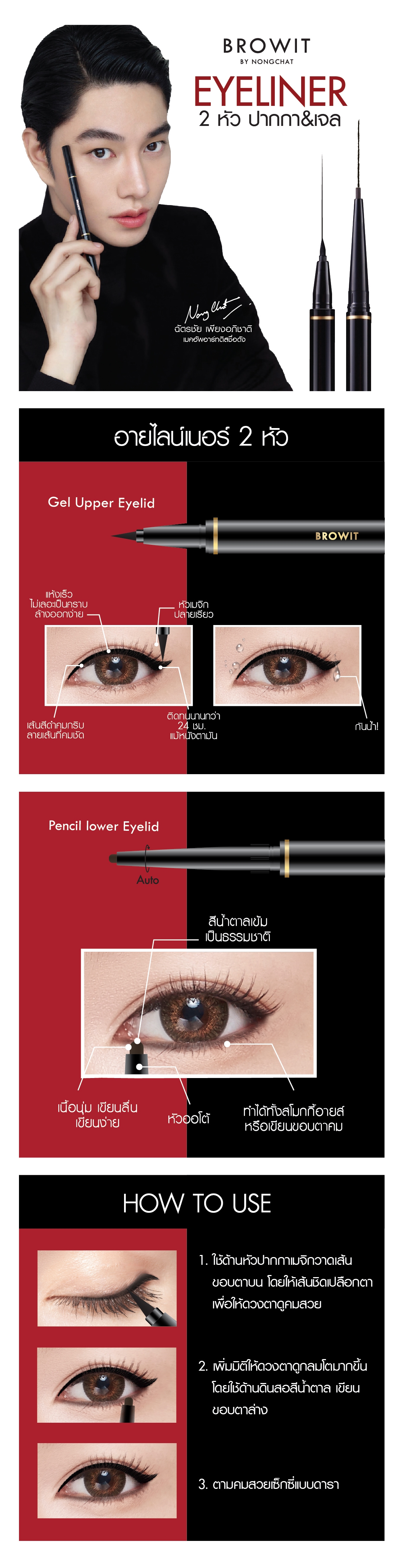 อายไลน์เนอร์ 2 หัวในแท่งเดียว ด้านหนึ่งเป็นหัวเมจิกปลายเรียว ให้เส้นคมกริบ เนื้อสีชัด แห้งไวไม่เลอะ สำหรับเขียนขอบตาบน อีกด้านเป็นดินสอเขียนขอบตาล่าง ดูเป็นธรรมชาติ เนื้อนุ่ม เขียนลื่น เขียนง่าย แม้เพิ่งเริ่มหัดเขียนครั้งแรก ทั้งสองหัวมาพร้อมสูตรกันเหงื่อ กันน้ำ ติดทนนาน ไม่เลือนหายตลอดวัน คัดสรรคุณภาพโดยช่างแต่งหน้ามืออาชีพ ระดับแนวหน้าของเมืองไทย