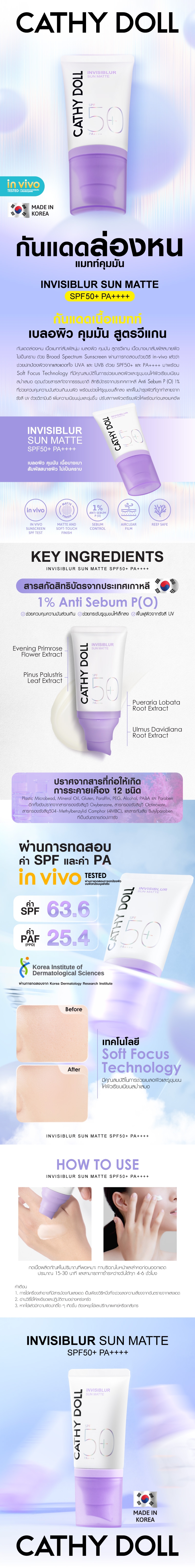 กันแดดล่องหน เนื้อแมทท์สัมผัสนุ่ม เบลอผิว คุมมัน สูตรวีแกน เนื้อบางเบาสัมผัสสบายผิว ไม่เป็นคราบ ด้วย Broad Spectrum Sunscreen ผ่านการทดสอบด้วยวิธี in-vivo แล้วว่าช่วยปกป้องผิวจากแสงแดดทั้ง UVA และ UVB ด้วย SPF50+ และ PA++++ มาพร้อม Soft Focus Technology ที่มีคุณสมบัติในการช่วยเบลอผิวและรูขุมขนให้ผิวเรียบเนียนสม่ำเสมอ อุดมด้วยสารสกัดจากธรรมชาติ สิทธิบัตรจากประเทศเกาหลี Anti Sebum P (O) 1% ซึ่งประกอบด้วย สารสกัดจากอีฟนิงพริมโรส (Evening Primrose Flower Extract) สารสกัดจากรากของต้นคูซู (Kudzu Root Extract) สารสกัดจากต้นไพน์ (Pine Needle Extract) และสารสกัดจากรากของต้นอุลมัส ดาวิเดียน่า (Ulmus Davidiana Root Extract) ที่ช่วยควบคุมความมันส่วนเกินบนผิว พร้อมช่วยให้รูขุมขนเล็กลง และฟื้นบำรุงผิวที่ถูกทำลายจากรังสี UV ด้วยวิตามินอี เพิ่มความเนียนนุ่มและชุ่มชื้น ปรับสภาพผิวเตรียมผิวให้พร้อมก่อนลงเมคอัพ ปราศจากสารที่ก่อให้เกิดการระคายเคือง 12 ชนิด คือ Microbead Plastic, Mineral oil, Gluten, Paraffin, PEG, Alcohol, PABA และ Paraben อีกทั้งยังปราศจากสารกรองรังสียูวี Oxybenzone สารกรองรังสียูวี Octinoxate สารกรองรังสียูวีบี 4-Methylbenzylid Camphor (4MBC) สารกันเสีย Butylparaben ที่เป็นอันตรายต่อปะการัง