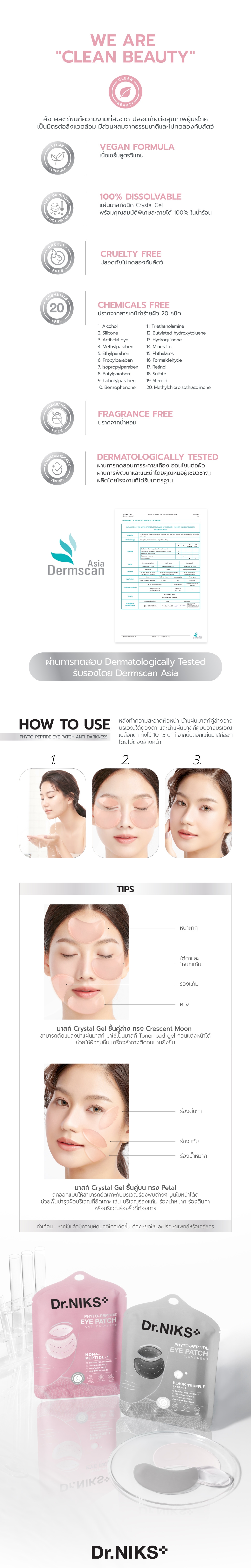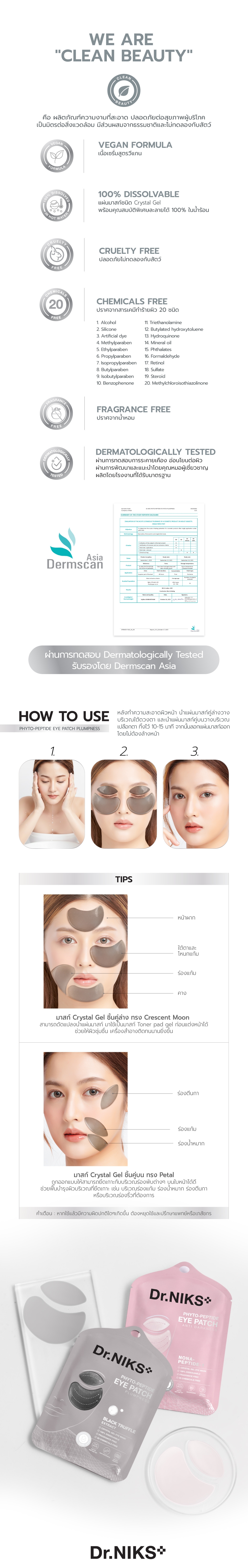 ดร.นิกส์ ไฟโต-เปปไทด์อายแพทช์ สูตรแอนตี้ดาร์กเนสส์ แผ่นมาสก์ชนิด Crystal Gel เนื้อนุ่ม แนบสนิทกับผิวบริเวณรอบดวงตา ตัวแผ่นช่วยปล่อยสารบำรุงให้สามารถทำงานได้อย่างล้ำลึกและต่อเนื่อง มาพร้อมนวัตกรรม Phyto-Peptide UP* การผสานพลังการทำงานของสาร 3 ชนิดที่ช่วยฟื้นบำรุงผิวบริเวณใต้ตาให้กลับมาชุ่มชื่น อิ่มฟู แลดูกระชับตั้งแต่ครั้งแรกที่ใช้ อุดมไปด้วยสารสกัดจากดอกซากุระ (Sakura Extract) ทำหน้าที่เป็นสารแอนตี้ออกซิแดนท์ พร้อมช่วยปรับผิวใต้ดวงตาให้แลดูกระจ่างใส พร้อมสารแอคทีฟ Nonapeptide-1 ช่วยส่งเสริมการสร้างคอลลาเจนพร้อมลดเลือนความหมองคล้ำ ตัวช่วยในการคืนความกระจ่างใสบริเวณใต้ดวงตา ให้แลดูสุขภาพดีอย่างอ่อนโยนและเห็นผล สูตรที่แนะนำโดยคุณหมอ ปราศจากน้ำหอมและสารทำร้ายผิว 20 ชนิด ใช้ได้แม้ผิวบอบบางแพ้ง่าย
