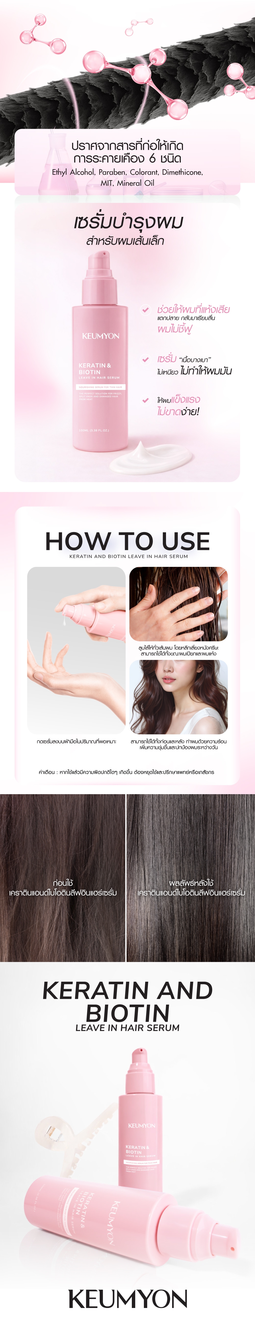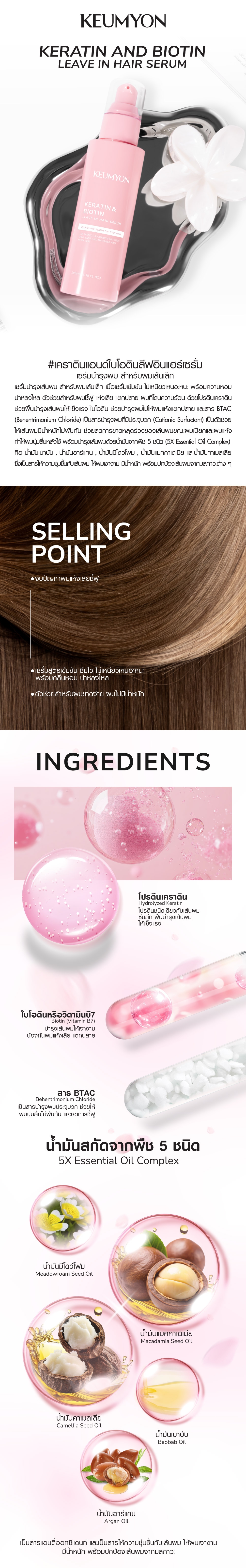 เซรั่มบำรุงเส้นผมสำหรับผมเส้นเล็ก เนื้อเซรั่มเข้มข้น ไม่เหนียวเหนอะหนะ พร้อมความหอมหวานน่าหลงใหล ตัวช่วยสำหรับผมชี้ฟู แห้งเสีย แตกปลาย ผมที่โดนความร้อน ด้วยโปรตีนเคราติน ช่วยฟื้นบำรุงเส้นผมให้แข็งแรง ไบโอติน ช่วยบำรุงผมไม่ให้ผมแห้งแตกปลาย และสาร BTAC (Behentrimonium Chloride) เป็นสารบำรุงผมที่มีประจุบวก (Cationic Surfactant) เป็นตัวช่วยให้เส้นผมมีน้ำหนักไม่พันกัน ช่วยลดการขาดหลุดร่วงของเส้นผมขณะผมเปียกและผมแห้ง ทำให้ผมนุ่มลื่นหลังใช้ พร้อมบำรุงเส้นผมด้วยน้ำมันจากพืช 5 ชนิด (5X Essential Oil Complex) คือ น้ำมันเบาบับ น้ำมันอาร์แกน น้ำมันมีโดว์โฟม น้ำมันแมคคาเดเมีย และน้ำมันคาเมลเลีย ซึ่งเป็นสารให้ความชุ่มชื้นกับเส้นผม ให้ผมเงางาม มีน้ำหนัก พร้อมปกป้องเส้นผมจากมลภาวะต่าง ๆ