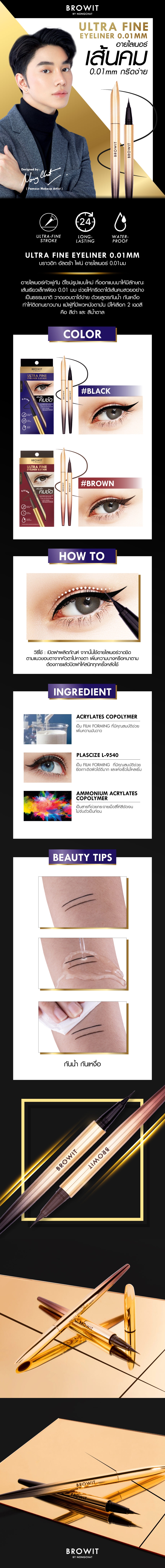 อายไลน์เนอร์หัวพู่กัน ที่ออกแบบมาให้มีลักษณะเส้นเรียวเล็กเพียง 0.01mm ช่วยให้กรีดตาได้สวยอย่างเป็นธรรมชาติ ดีไซน์หัวพู่กันรูปแบบใหม่ ด้วยขนแปรงที่ทำให้วาดขอบตาได้ง่าย ติดทนยาวนาน แม้ผู้ที่มีผิวบริเวณหนังตามัน ด้วยสูตรกันน้ำ กันเหงื่อ