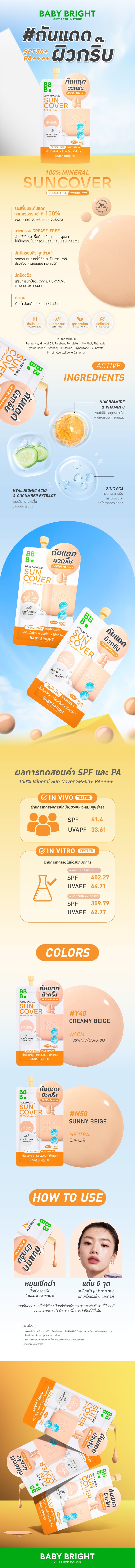 กันแดดรองพื้น 2 ฟังก์ชั่นในหนึ่งเดียว เพื่อผิวสวยครบ จบในขั้นตอนเดียว ด้วย เบบี้ไบร์ท 100% มิเนอรัลซันคัฟเวอร์ SPF50+ PA++++ รวมคุณสมบัติของรองพื้นและสารกันแดดจากแร่ธาตุธรรมชาติ 100% เหมาะสำหรับผิวแพ้ง่ายและผิวเป็นสิว พร้อมนวัตกรรม Crease-Free ช่วยให้เนื้อรองพื้นเรียบเนียน เบลอรูขุมขน ไม่เป็นคราบ ไม่ตกร่อง เนื้อสัมผัสนุ่มลื่น เกลี่ยง่าย มอบการปกปิดรอยสิว จุดด่างดำ และความหมองคล้ำได้อย่างเป็นธรรมชาติ ปรับสีผิวให้เรียบเนียน กระจ่างใส พร้อมทั้ง กันน้ำ กันเหงื่อ ติดทน ปกป้องผิวจากรังสี UVA/UVB และมลภาวะภายนอกได้อย่างมีประสิทธิภาพ อุดมด้วยสารบำรุงผิว ไนอะซินาไมด์ (Niacinamide) และวิตามินซี (Vitamin C) ช่วยให้ผิวแลดูกระจ่างใส เรียบเนียน ลดเลือนรอยดำรอยแดง ไฮยารูรอนิก เอซิด (Hyaluronic Acid) และสารสกัดจากแตงกวา (Cucumber Extract) ช่วยเติมความชุ่มชื้น ปลอบประโลมผิว และซิงค์ พีซีเอ (Zinc PCA) ช่วยควบคุมความมัน กระชับ รูขุมขน ลดโอกาสการเกิดสิว เผยผิวเนียนใส ดูสุขภาพดีอย่างเป็นธรรมชาติ พร้อมการปกป้องและบำรุงในขั้นตอนเดียว
